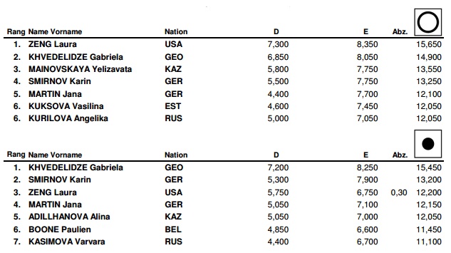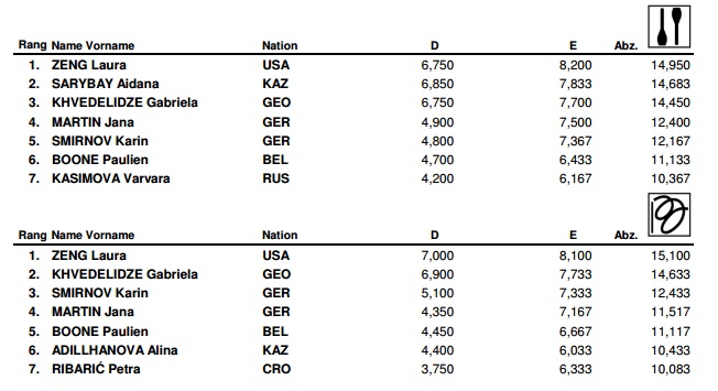 In junior competition, gold in all-around went to Laura Zeng (U.S.A) with 56,867 points, followed by Gabriela Khvedelidze (GEO) (56,566) and Jana Martin (GER) (51,901).