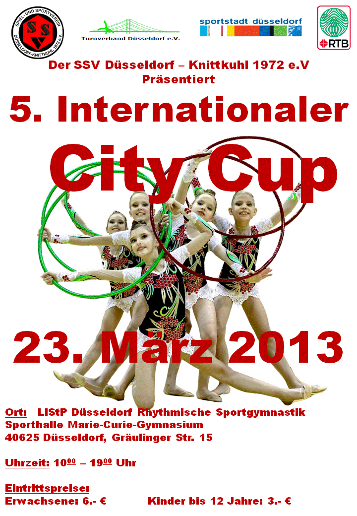 Düsseldorf es la ciudad anfitriona de este torneo internacional de gimnasia rítmica “City Cup”, dirigido a gimnastas individuales. Más de 100 participantes de diferentes países acudieron a esta competición. las categorís fueron : 7 años de edad, 8, 9, pre-junior, junior y senior. Los países participantes entre otros, fueron Rusia, Polonia, Estonia, Bélgica y Alemania.