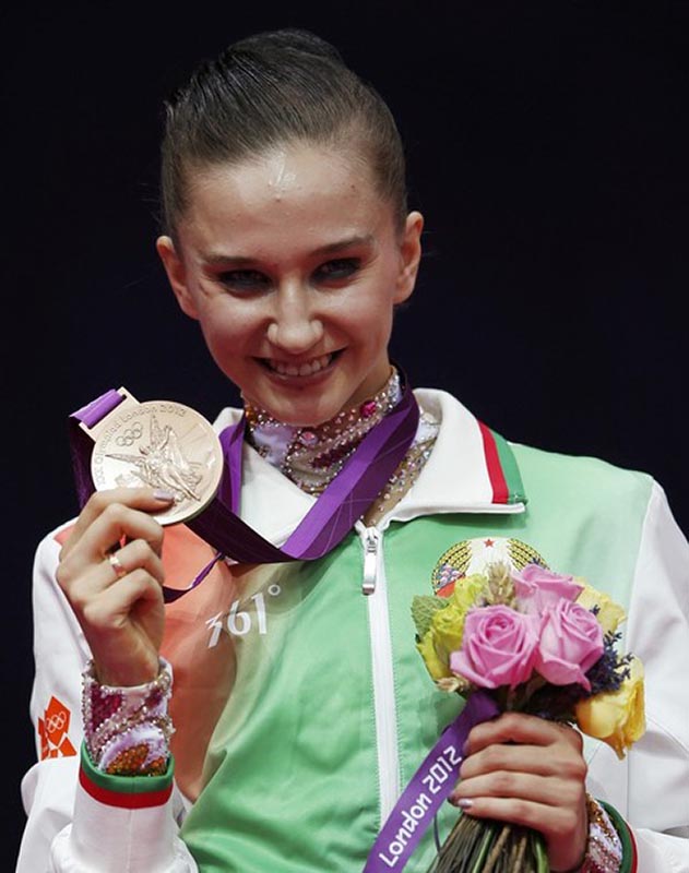 Belarus’ Liubou Charkashyna celebrates with her bronze medal in the victory ceremony after the individual all-around rhythmic gymnastics final at Wembley Arena during the London 2012 Olympic Games August 11, 2012. REUTERS/Marcelo Del Pozo (BRITAIN – Tags: SPORT GYMNASTICS OLYMPICS)