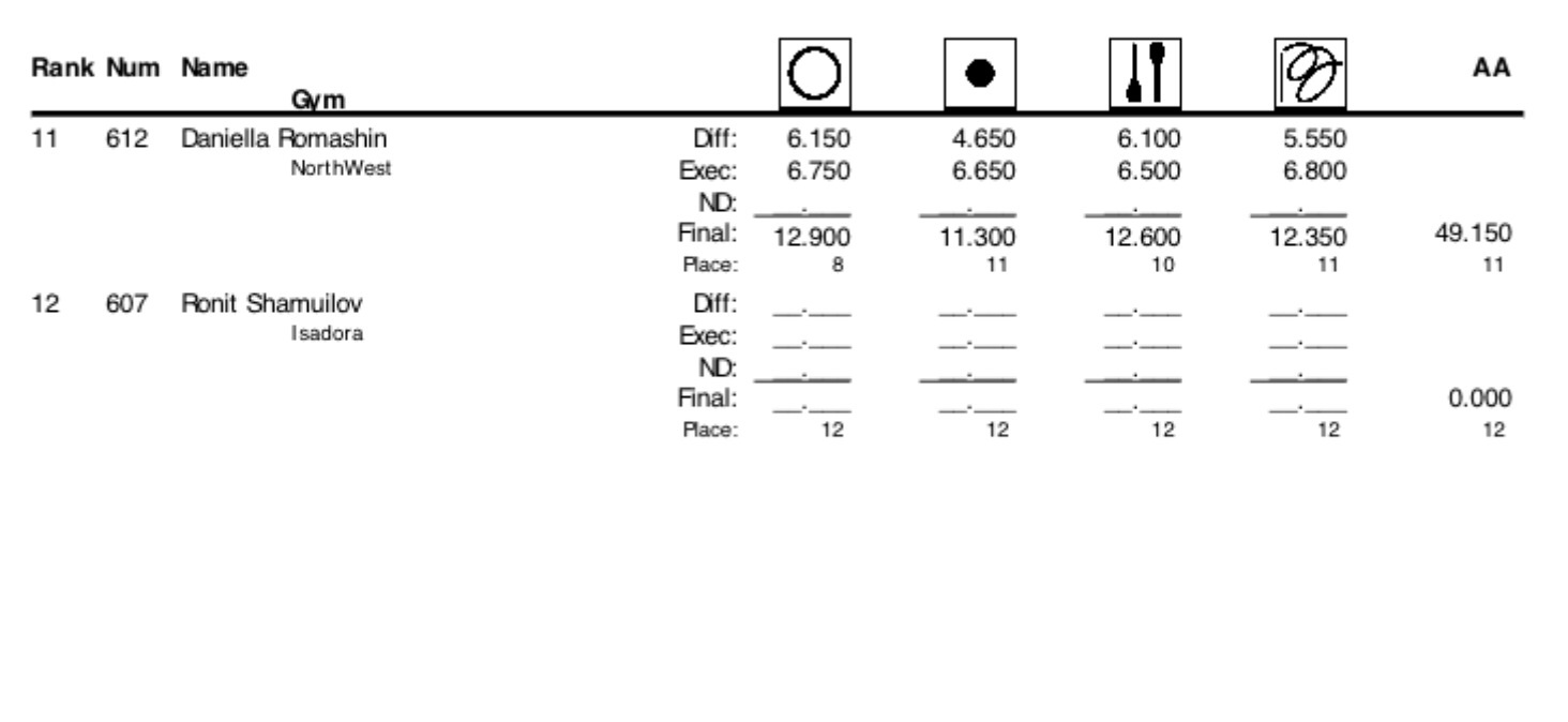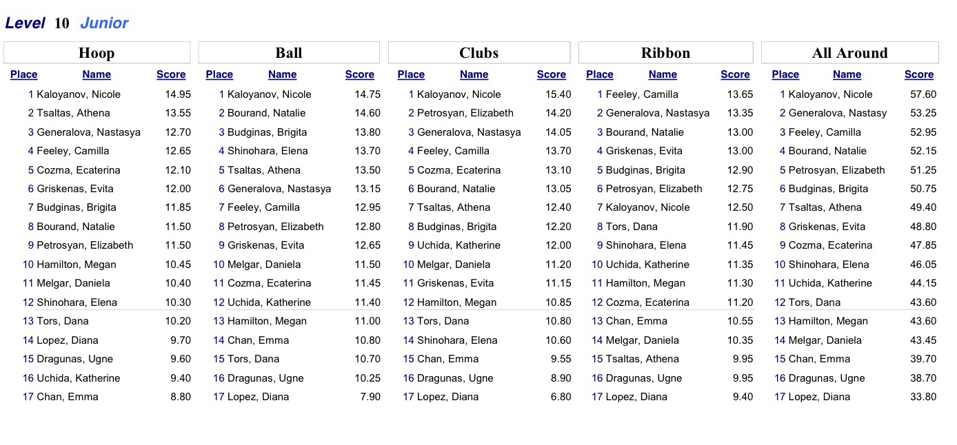 The Senior All-Around winner was Rebecca Sereda, followed by Aliya Protto and Jazzy Kerber. Cindy Lu of Isadora/Staten Island, N.Y., was fourth, and Serena Lu finished fifth in the all-around.