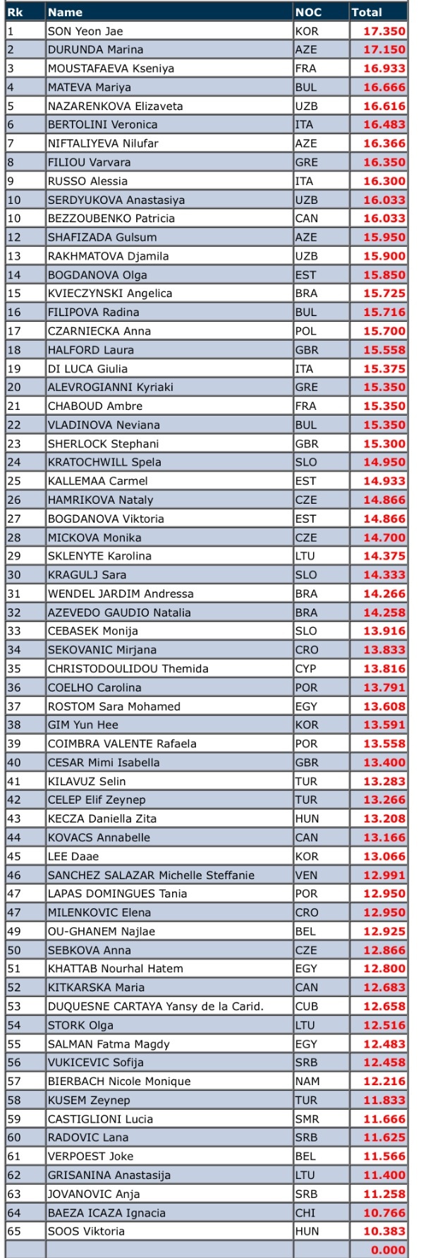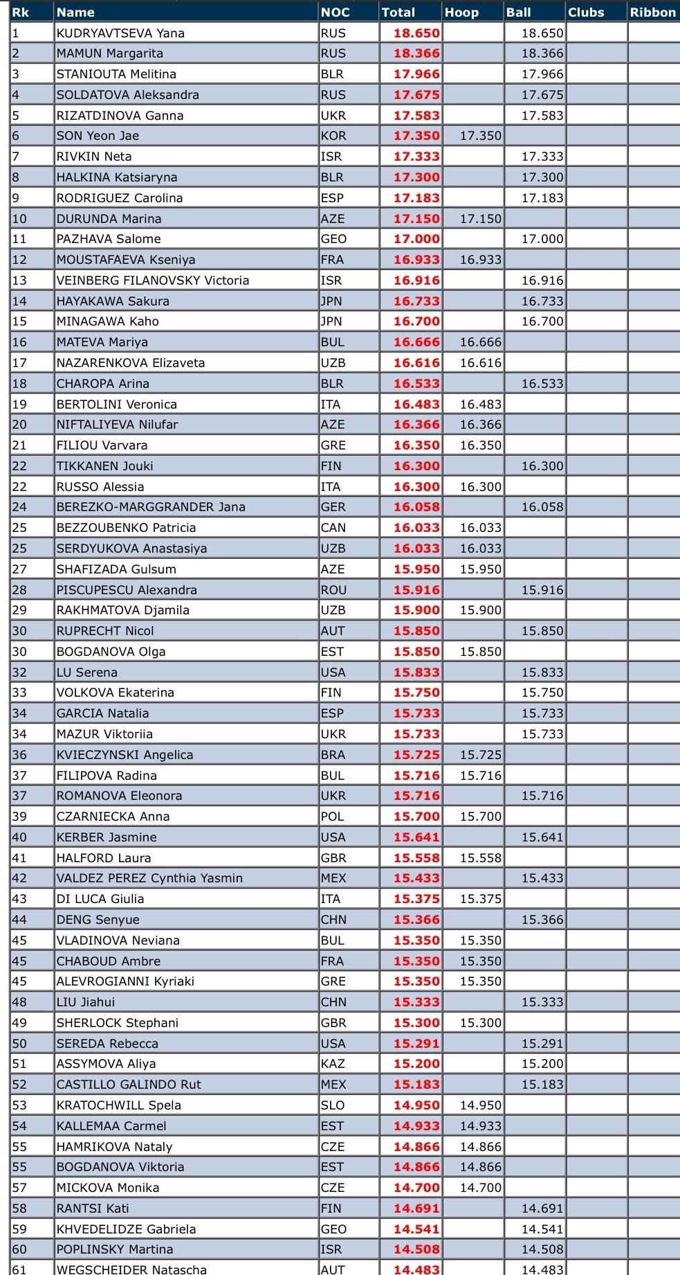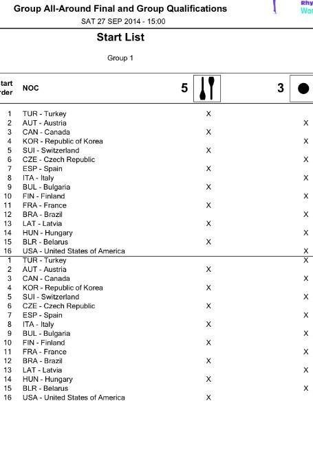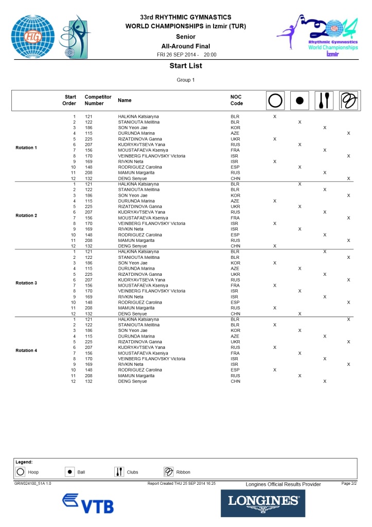 En la primera jornada clasificatoria, España demostró ser el país más fuerte en la primera rotación. Rusia, Las grandes favoritas, cometieron un error que las alejaría del podio en la clasificación general y les denegaría el acceso a las finales por aparatos en mazas. En una segunda rotación, con 3 cintas y dos pelotas, las españolas cometen diversos errores, lo que hizo que impidieran ser medalla en la clasificación general.