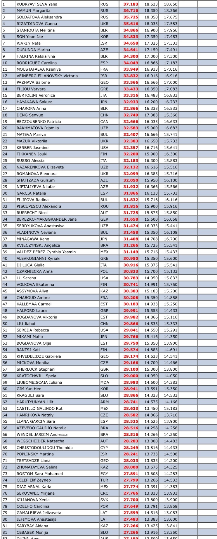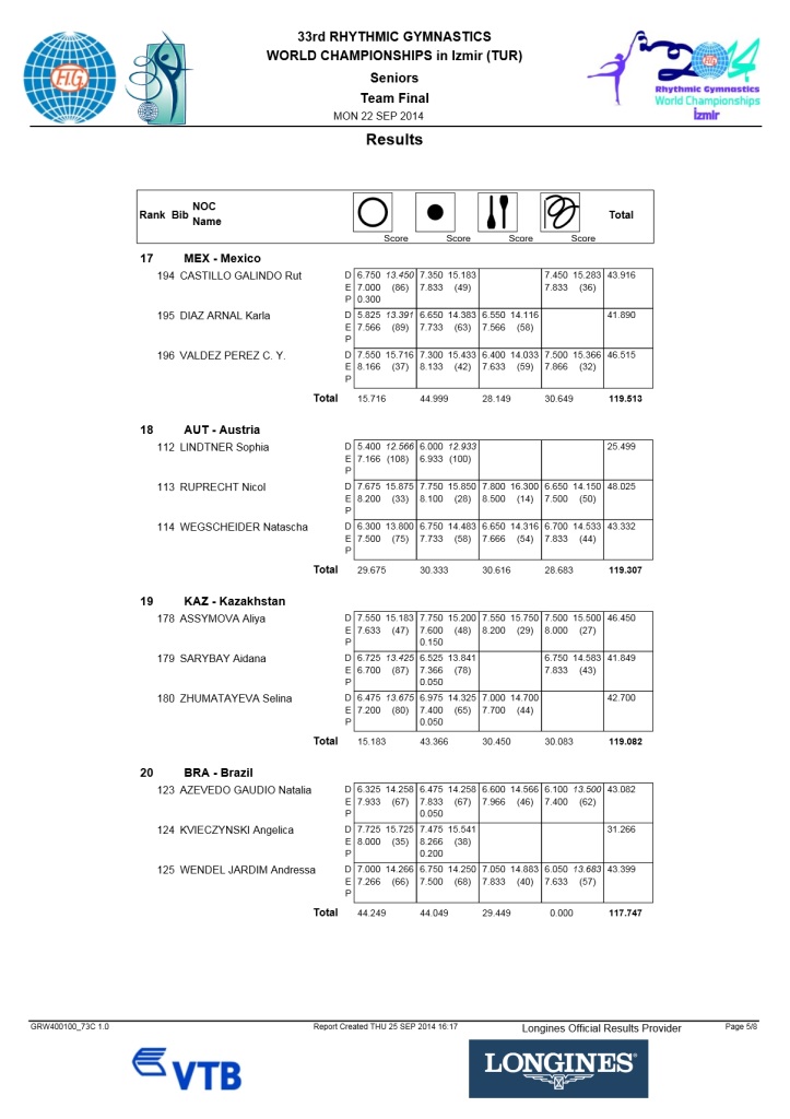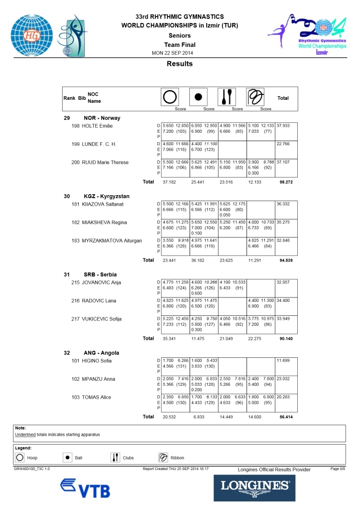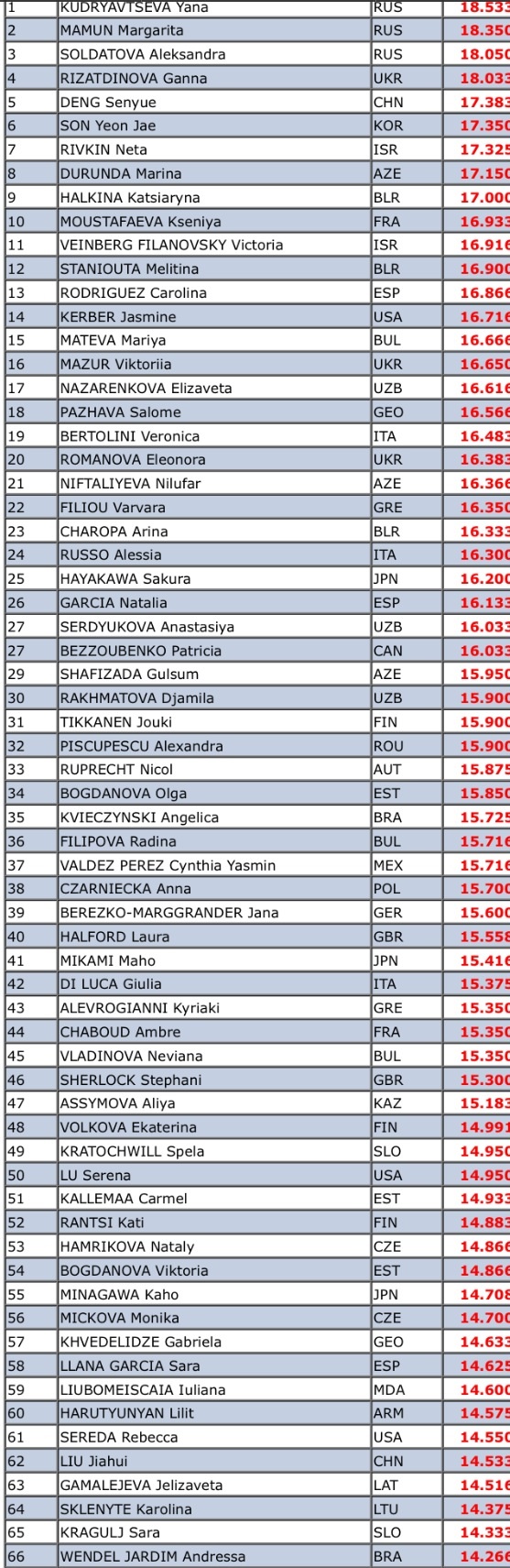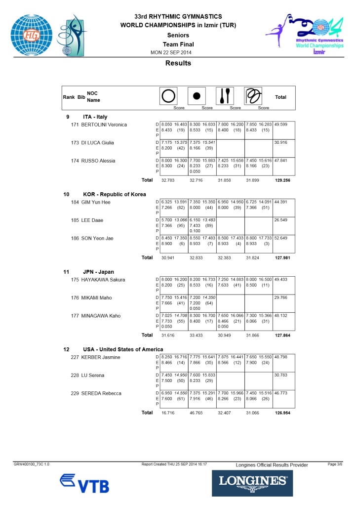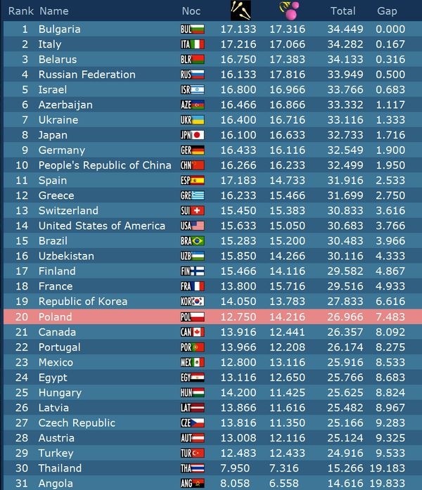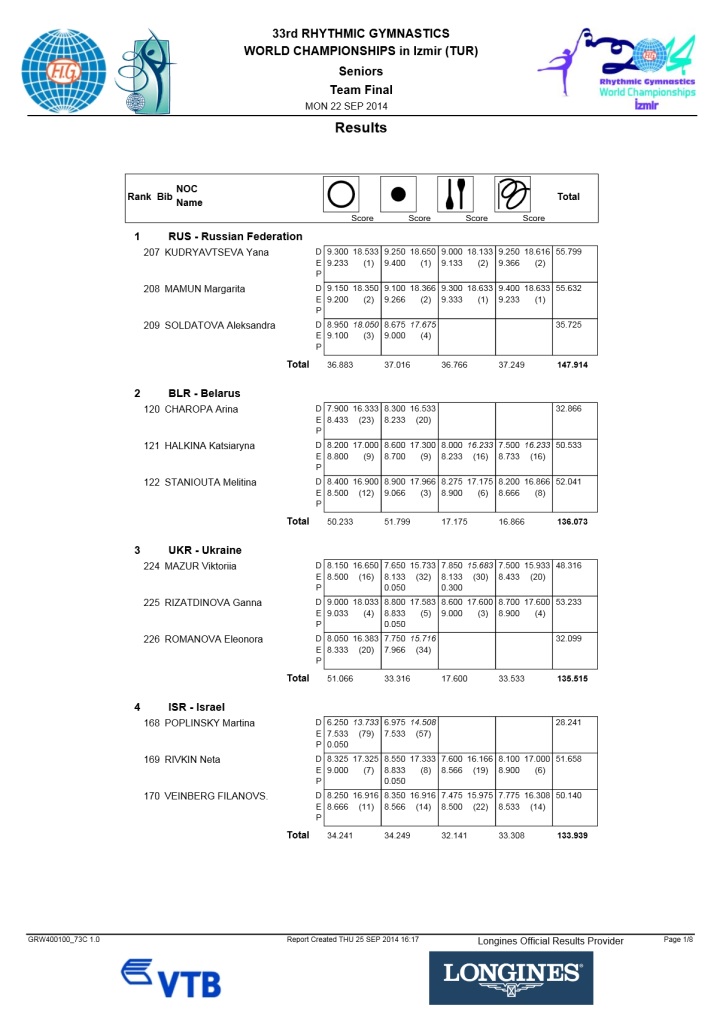 Para sorpresa general, el magnífico conjunto de Bulgaria consigue el primer puesto en la clasificación general seguido de Italia y Bielorrusia. El nuevo código de puntuación adaptado tras los juegos olímpicos de Londres 2012, penaliza duramente los fallos cometidos durante los ejercicios. Esto se traduce en que cualquier imprecisión o error aleja del pódium incluso a los mejores ejercicios, premiando así la rutinas sin errores.