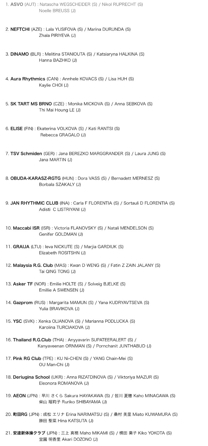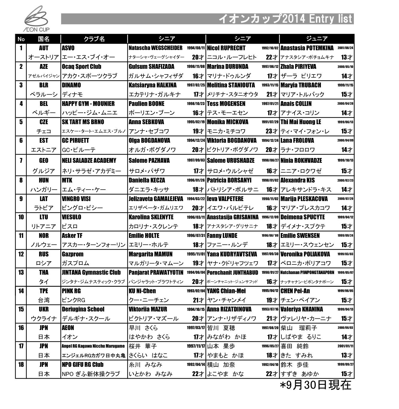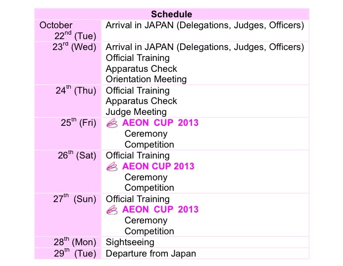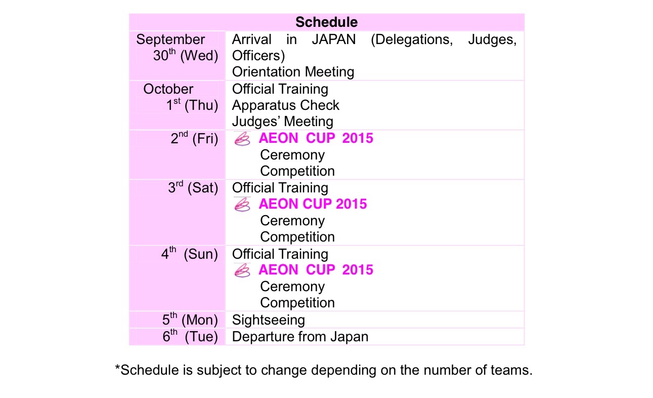 The 2018 AEON CUP Worldwide R.G. Club Championships, will be hosted by the Japanese Gymnastics Association, this AEON Cup will begin from the 28th to 30th of September in Japan. Teams consist of 3 gymnast: two senior gymnast and a junior gymnast.