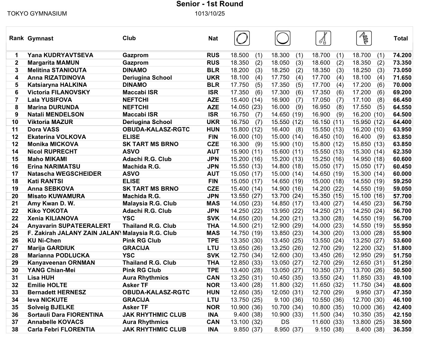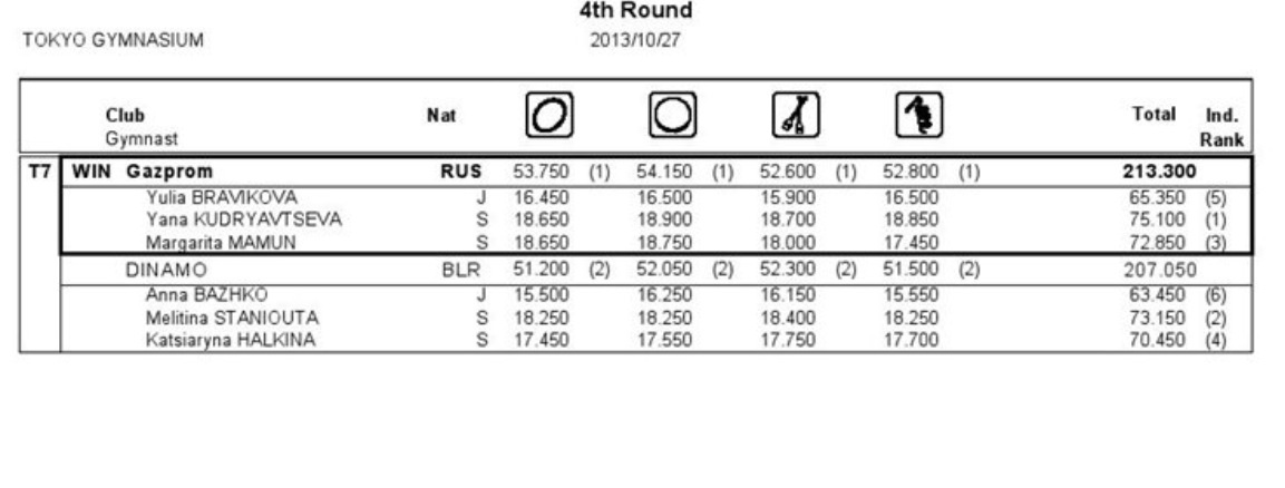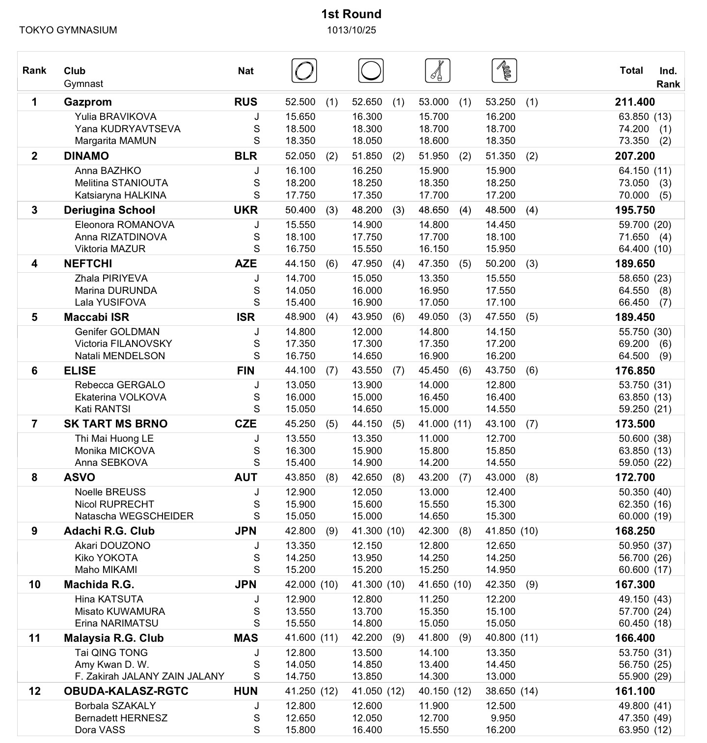Each team competes with 12 routines: 8 senior routine (2 individual gymnast) and 4 junior routine (1 individual gymnast).