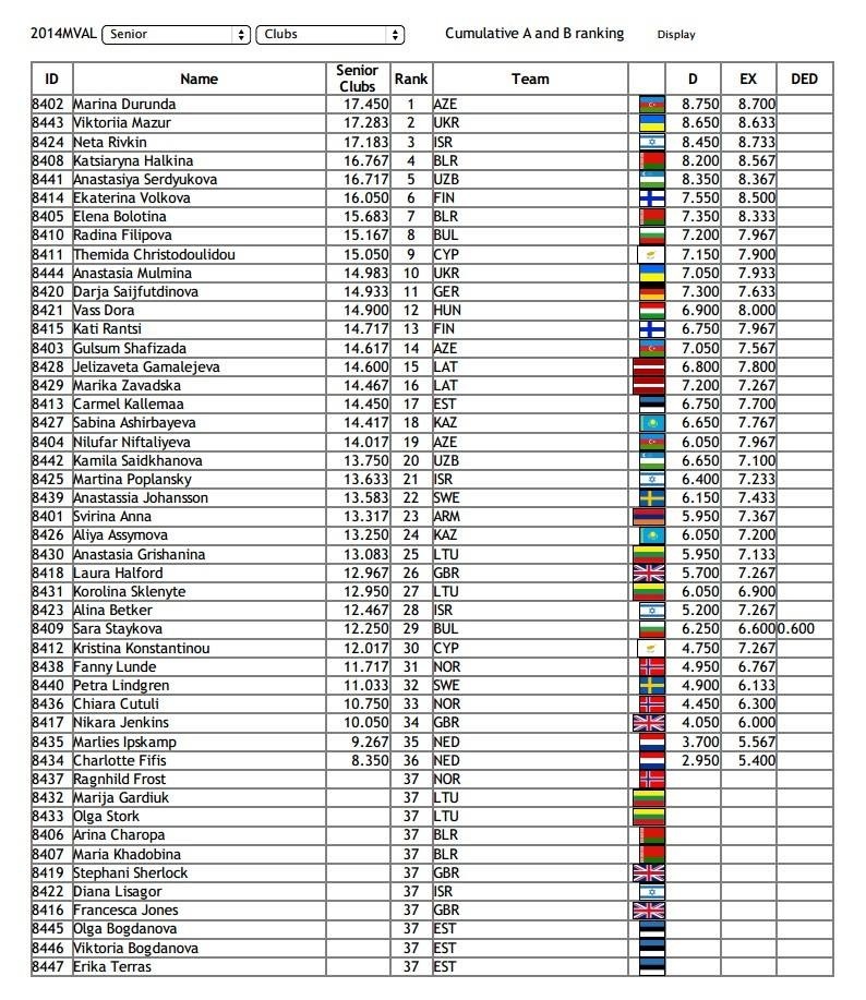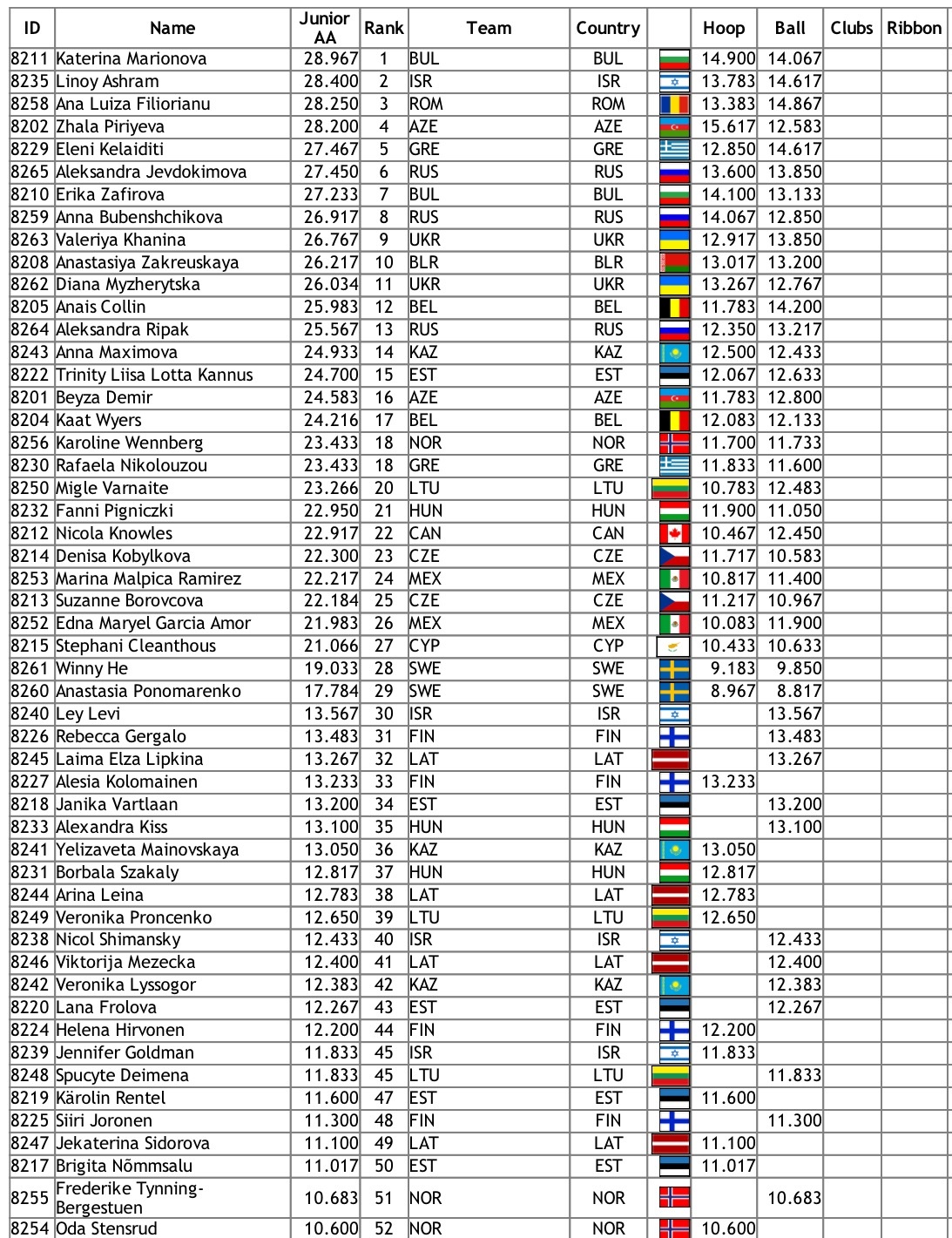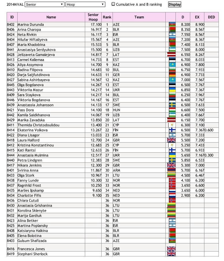 Marina Durunda from Azerbaijan was one of the stars of this competition, getting more than 17 points in one of her routines. Viktoriya Mazur and Anastasiya Mulmina, from Ukraine also made some mistakes and Mulmina ended her ball routine with the apparatus out of the carpet.